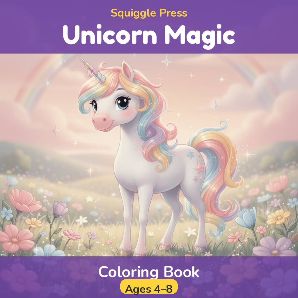 Step into a world of magic and wonder with the Unicorn Magic Coloring Book! This 30-page digital coloring book features adorable unicorns, shimmering rainbows, glittering stars, and enchanted scenes that kids ages 4–8 will absolutely love.